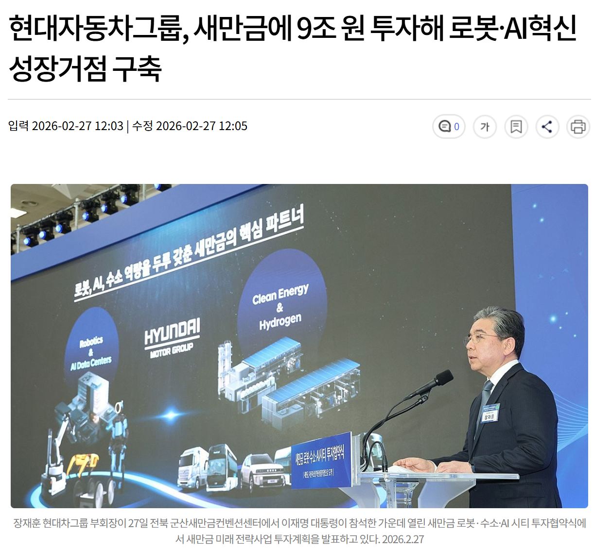 https://imnews.imbc.com/news/2026/econo/article/6803711_36932.html 현대자동차그룹이 로봇과 AI 등 미래 신사업 육성을 위해 전북 새만금 지역에 9조 원을 투자합니다. 현대차는 오늘 이재명 대통령과 김정관 산업통상부 장관 등이 참석한 가운데 피지컬 AI구현을 위한 데이터 센터에 5조 8천억 원을, 로봇 완성품 제조 및 파운드리 공장과 부품 단지로 구성된 클러스터 조성에 4천억 원을 투자하는 등 내용의 새만금 투자 협약을 체결했습니다. 현대차는 AI 데이터센터에 단계적으로 GPU 5만 장급 연산 능력을 갖추고, 스마트 팩토리 구현에 필요한 막대한 데이터를 처리해 저장할 계획입니다. 이번 투자는 지난해 현대차그룹이 지난해 발표한 125조 2천억 원 규모 국내 중장기 투자 계획 가운데 핵심 프로젝트로, 약 16조 원에 달하는 경제 효과를 유발할 것으로 기대됩니다. 기사 내용 전부를 가져왔는데 이래서 6% 넘게 올랐습니다. 진짜 무슨 일이 있어서 갑자기 9조 투자를 덜덜덜... 이 대통령은 통 큰 결단이라고 했지만 뭔가뭔가 있어서 한 거겠쪄.? 0