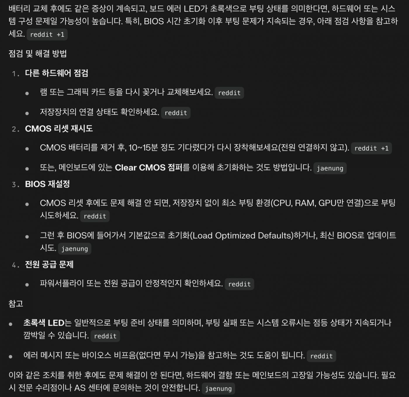 보드 에러 표시 led는 정상적으로 초록불이 차례로 점등되다가 부팅에서 초록불 상태에서 멈춤.