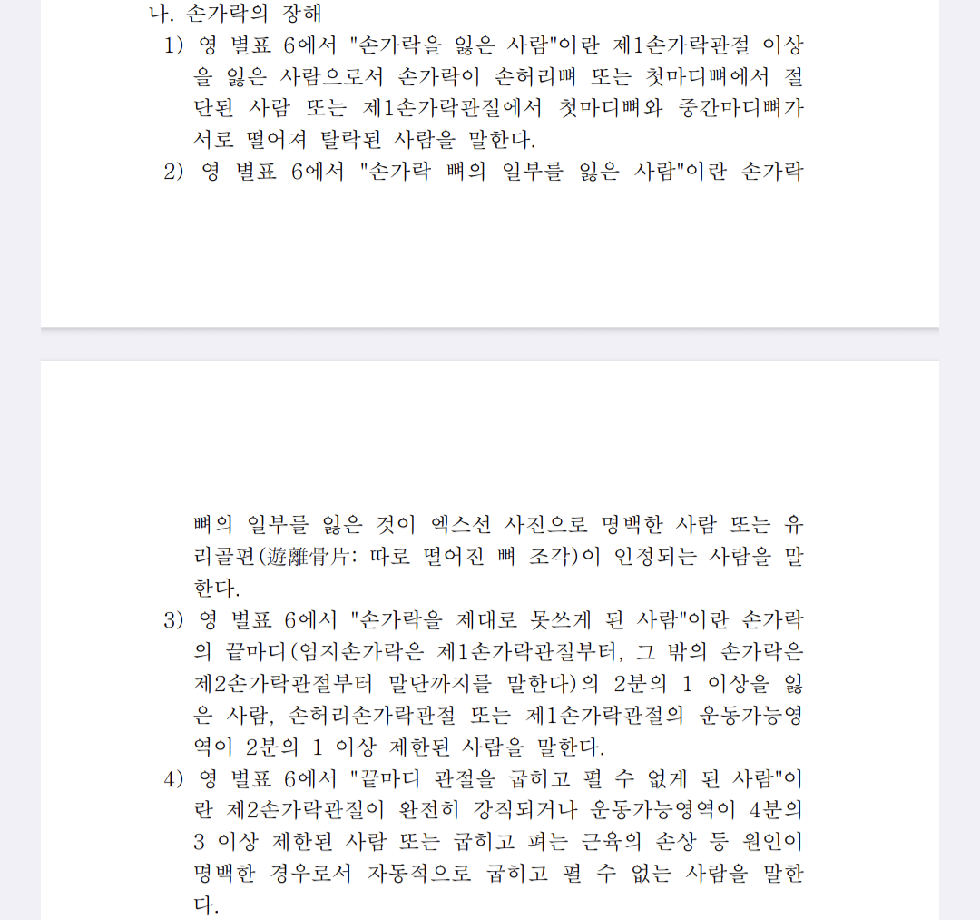 한쪽 손의 5개의 손가락 또는 엄지손가락과 둘째 손가락을 포함하여 4개의 손가락을 제대로 못 쓰게 된 사람