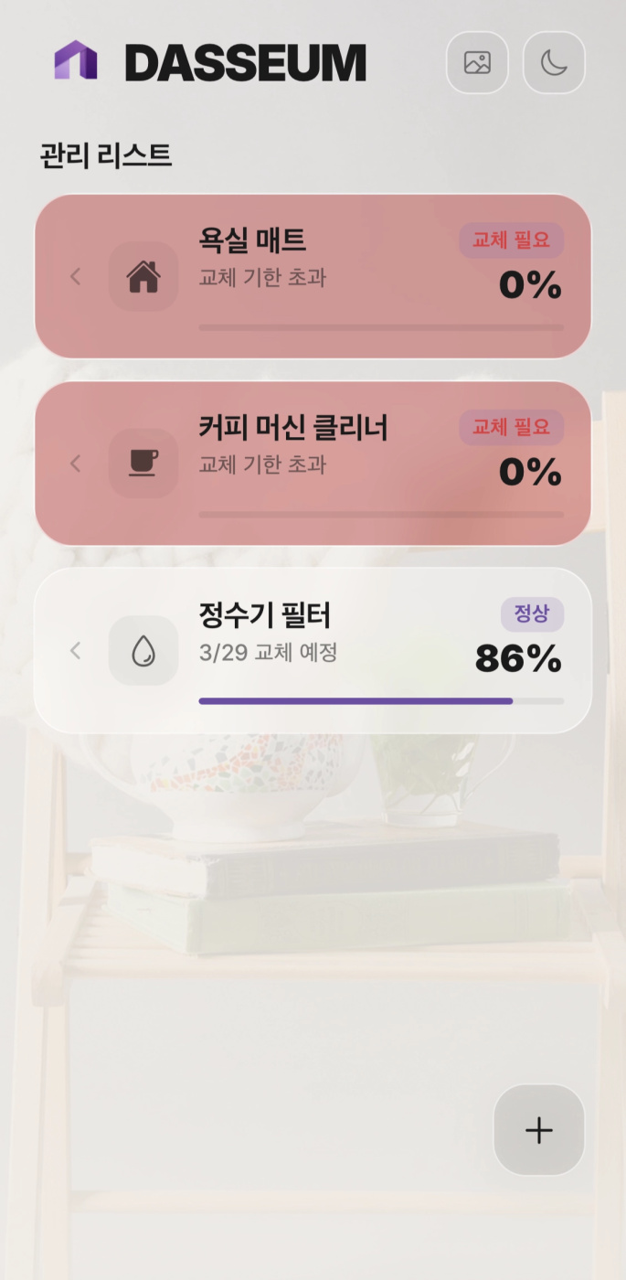 안녕하세요! 3주 전 즈음 샤워기 필터 갈색으로 변한 거 보고 현타 와서 앱 기획 중이라고 의견 여쭤봤던 기획자입니다. 기억하실지 모르겠네요! 그때 생각보다 많은 분들이 솔직하게 의견 주시고, 주기 관리가 필요한 물품도 많이 추천해주셔서 앱 만드는데 정말 큰 도움이 되었어요. (그때 댓글 주신 분들 다시 한번 진심으로 감사드립니다!) 이름은 고민하다가 다 쓴 물품 관리해준다는 의미로 '다씀(DASSEUM)'이라고 지어봤습니다 지난번에 주신 의견들 반영해서 이렇게 만들었습니다! - 품목 커스텀:개인이 품목 주기를 커스텀하면 좋을 것 같다 하셔서 정해진 품목들 외에도 커스텀할 수 있게 구현 해놨습니다. - 교체 시급 순 정렬: 보기 편하도록 교체 시기가 임박한 소모품이 제일 위에 오도록 정렬 해놓았어요 - 빠른 리셋&삭제: 교체하고 나서 왼쪽으로 스와이프하면 리셋&삭제 버튼이 뜨도록 만들었어요. 사실 제가 만들어놓고 좀 아쉬워서 .. 다음 업데이트 할것도 미리 생각해봤는데요 .. 간단하게만 말씀 드리면 교체 미루기 버튼, 교체 알림 기능, 소모품 구매 내역 저장 기능 이렇게 생각하고 있어요. 일단 처음 출시 때는 기본적인 기능만 구현하려고 했고 점점 업데이트 해가면서 기능 추가하려고 하고 있습니다. 아직 초기 버전이라 부족한 점이 많겠지만, 저번처럼 솔직하게 피드백 주시면 또 부지런히 고쳐보겠습니다! 안드로이드 https://play.google.com/store/apps/details?id=com.pathfinder.dassum&pcampaignid=web_share IOS : https://apps.apple.com/kr/app/%EB%8B%A4%EC%94%80-da-sseum/id6759442495 4