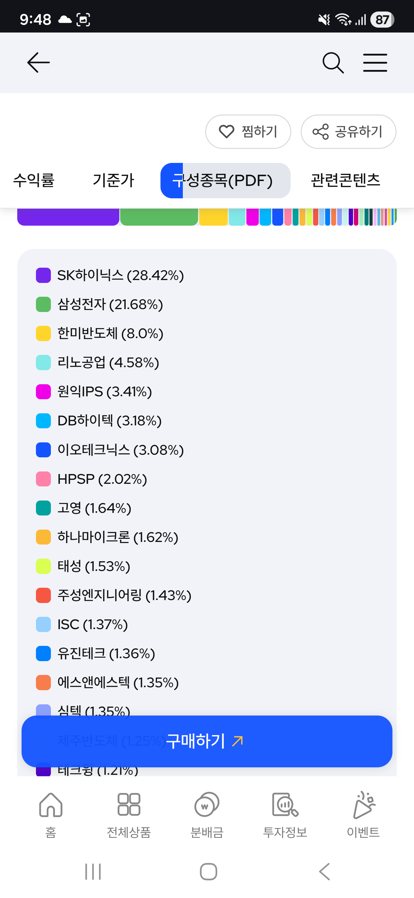 KRX 반도체지수 추종하는 고덱쓰(타이가도 있음) 반도체 ETF 구성상황입니다. 3