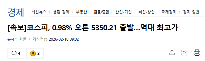 요즘 경제지 코스피 담당 기자들은 호시절일 거 같아요. 지수 1% 올랐는데 뉴스거리(역대최고)가 뜨니. 매일 아침에 코스피 창 확인하고 아래로 꺾이면 "붕괴" 위로 꺾이면 "역대 최고" 쓰면 된다니 5