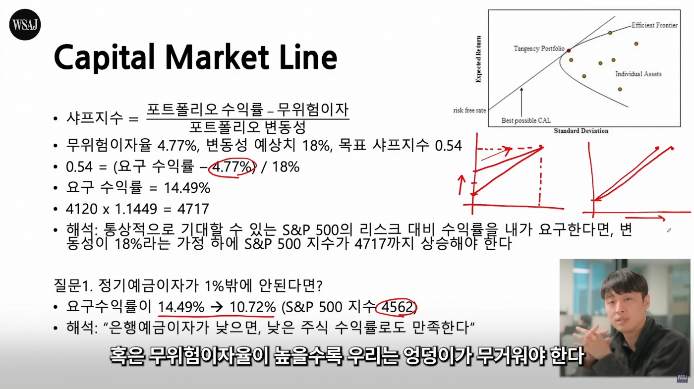 요걸 샤프지수 기반으로 휴리스틱 해 볼 수 있는데, 초단기국채 수익률도 5%에 달했던 2년 전 기준으로 보면 S&P로 최소한 15% 정도 수익은 내줘야 예금 대신 주식 투자하는 의미가 있다는 이야기.