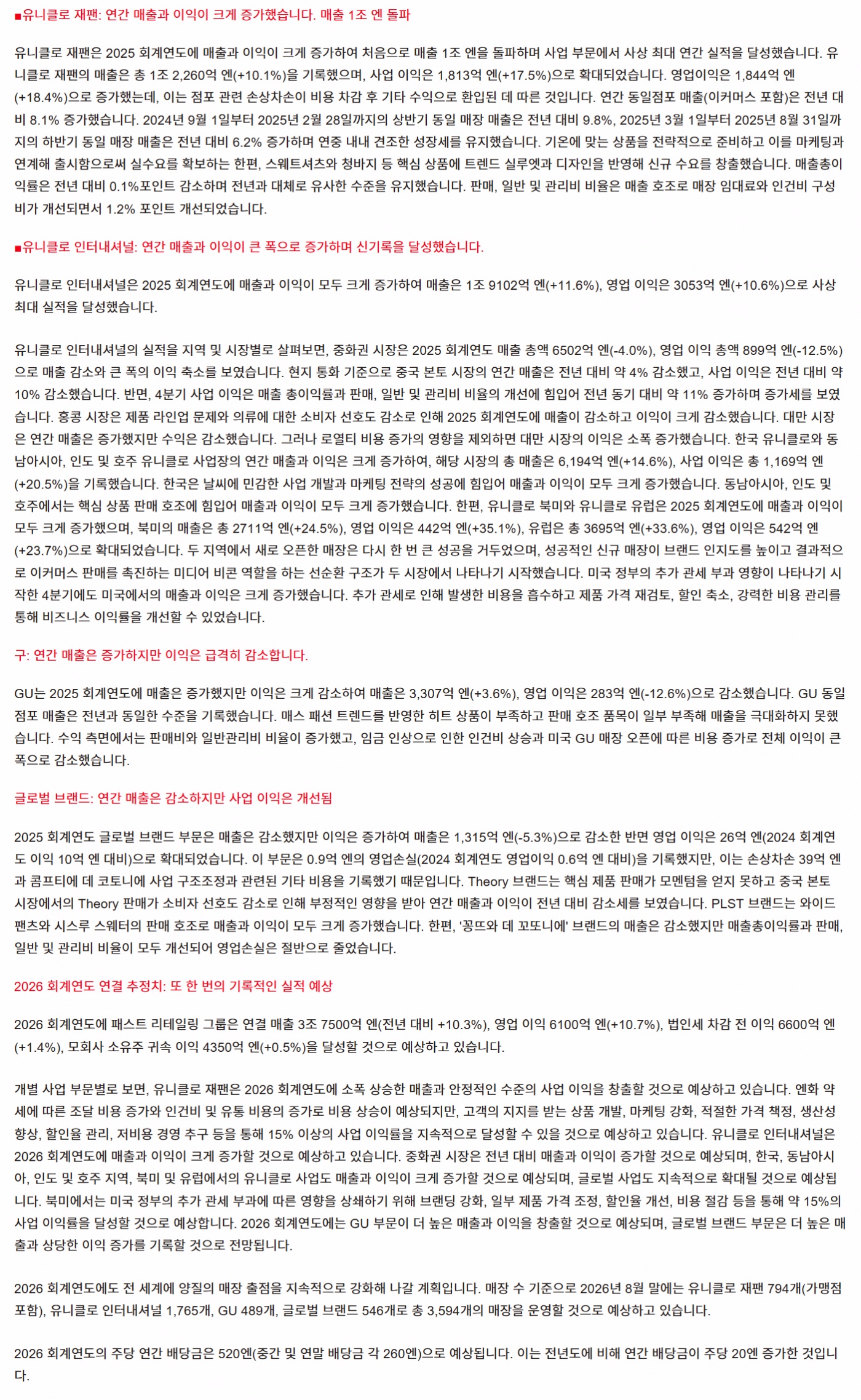 유니클로 실적 좋군요. Fast Retailing 2026 회계연도 추정치도 연매출, 순이익이 사상 최대치로 각각 약 34조 8천억원, 4조원을 넘을 것으로 예상했네요.