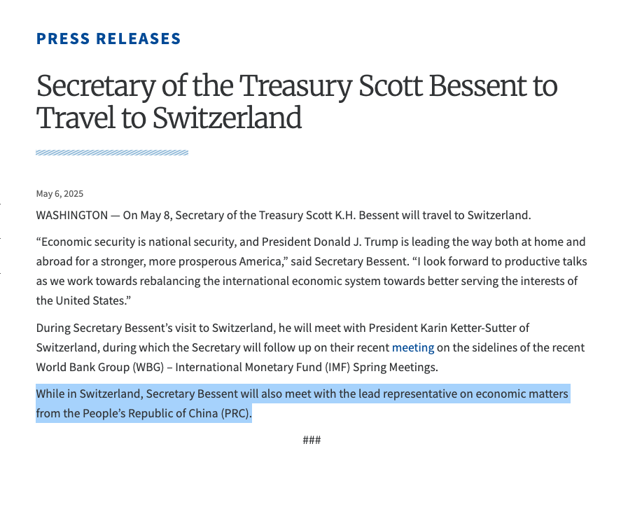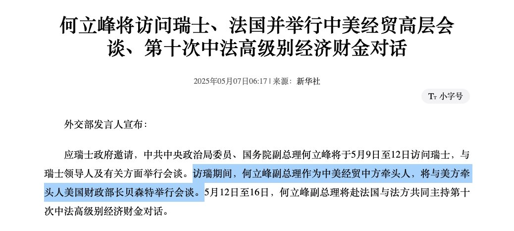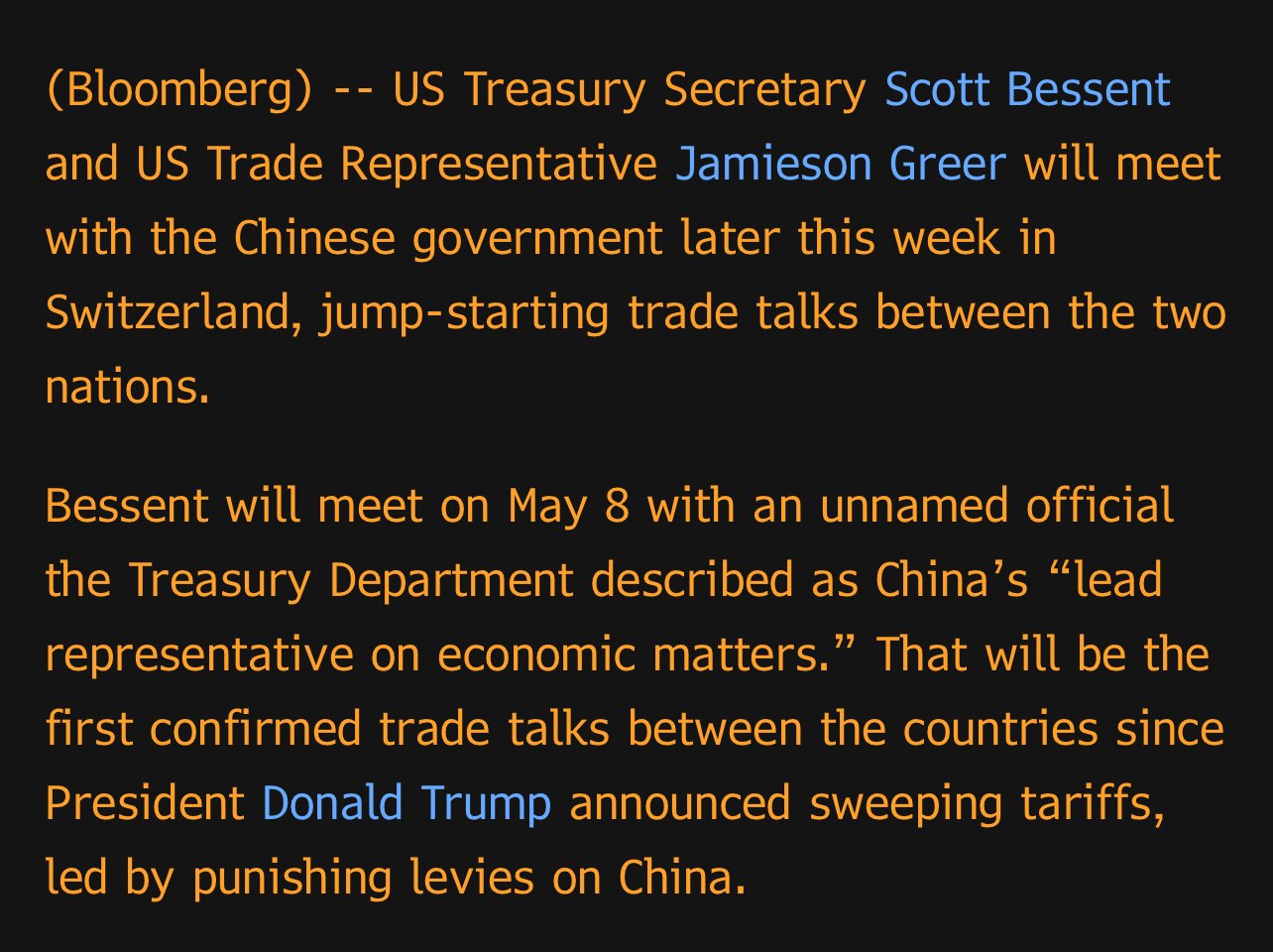 오늘 중국 재무 당국의 중국 증시 오픈 전 브리핑이 있을 예정입니다. 작년 10월 브리핑과 비슷할 것 같다는 예상도 있군요. 별개로 배센트 미 재무장관과 그리어 무역대표부 대표 등이 중국 측과 이번 주(5월 8일?)에 만날 것이라는 얘기도 있습니다.